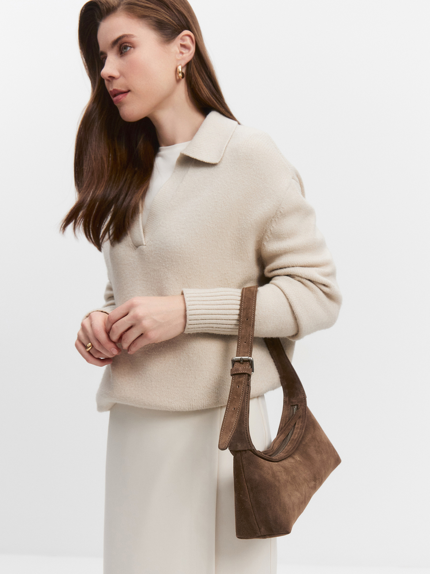 Эта миниатюрная хобо выполнена из итальянской замши премиального качества, что придает ей особый лоск. Регулируемый плечевой ремень позволяет подобрать оптимальную длину для комфортного ношения сумки. Модель дополнена одним отделением на молнии, в которое вмещается все необходимое.