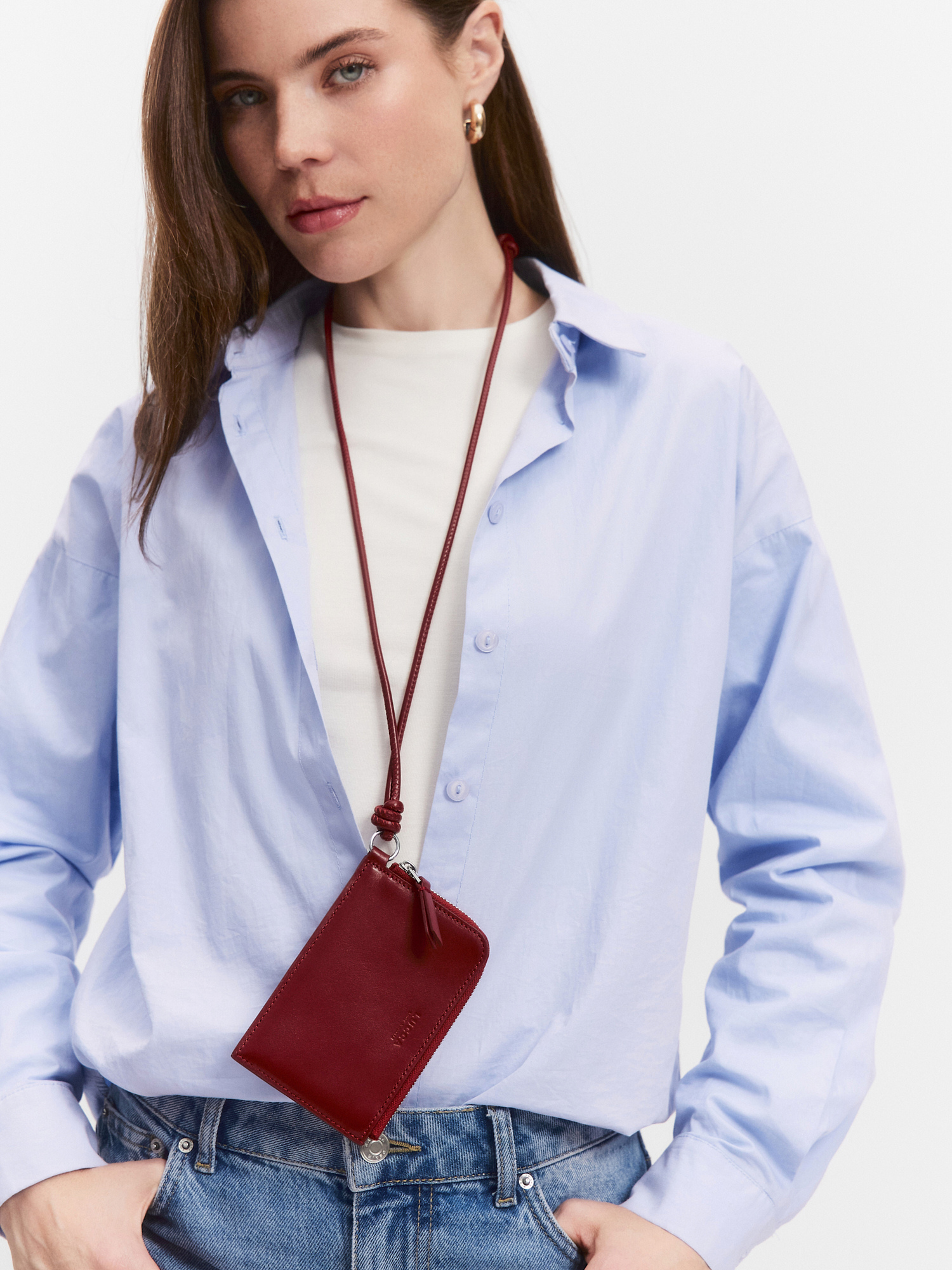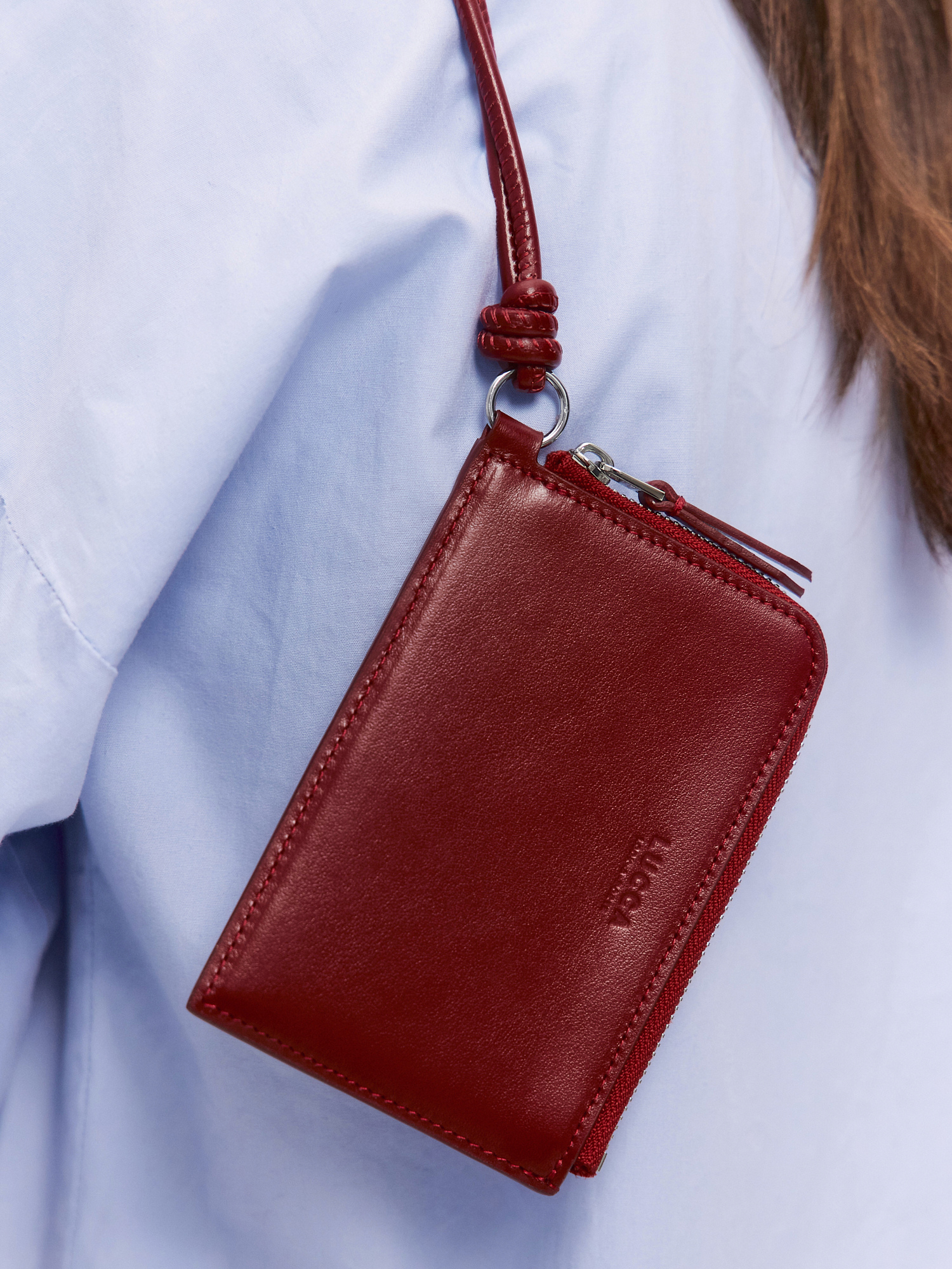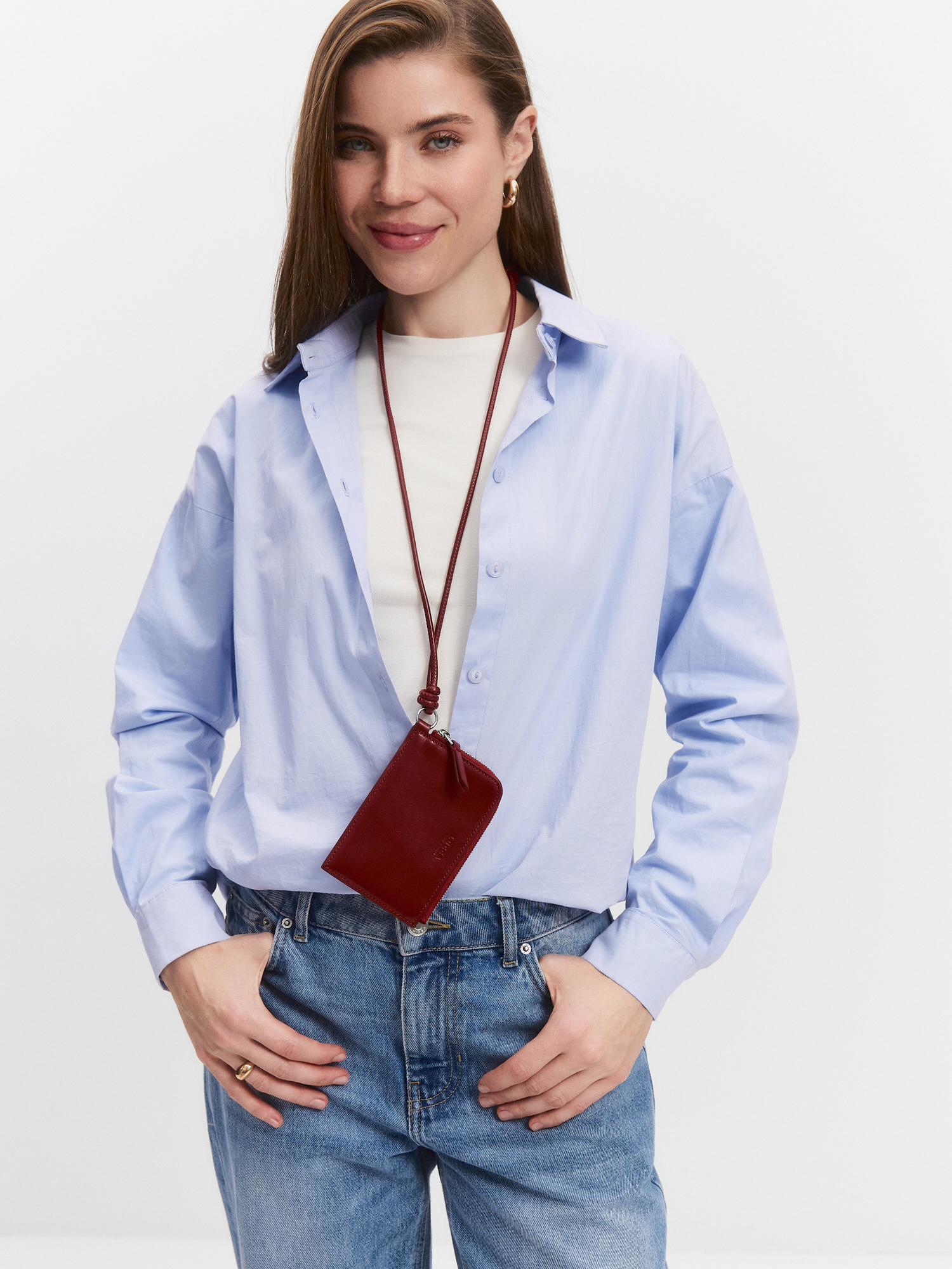 Аксессуар для хранения купюр и пластиковых карт, выполненный в формате удобного чехла с регулируемым ремешком, для ношения на шее. Основное отделение на молнии вмещает купюры, на задней стенке кармашек для карты.