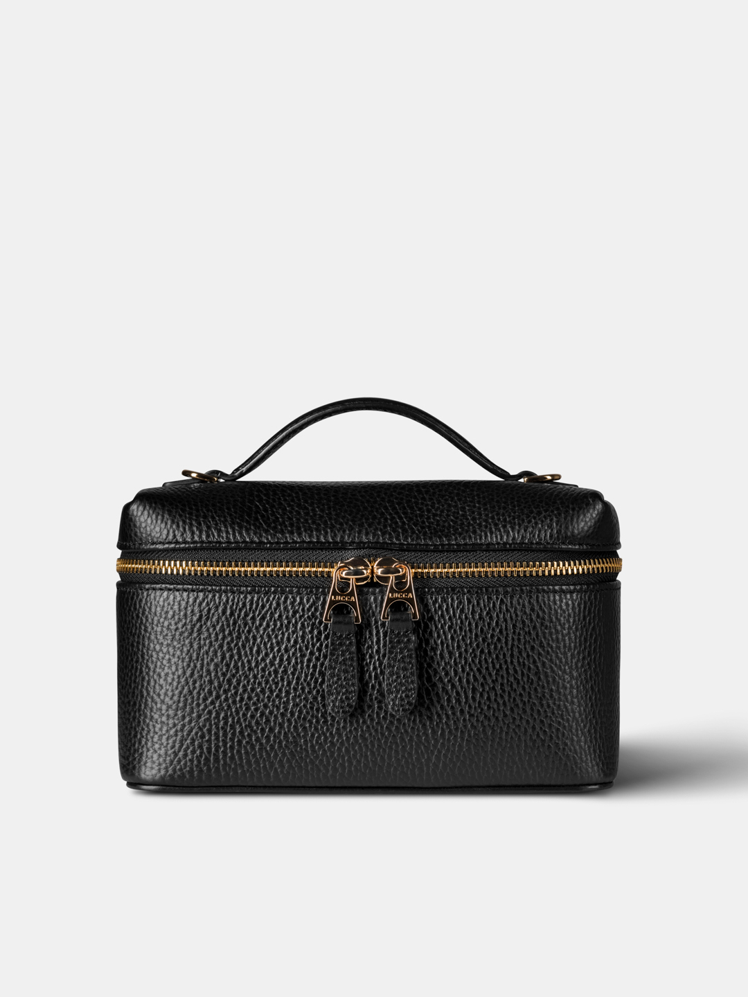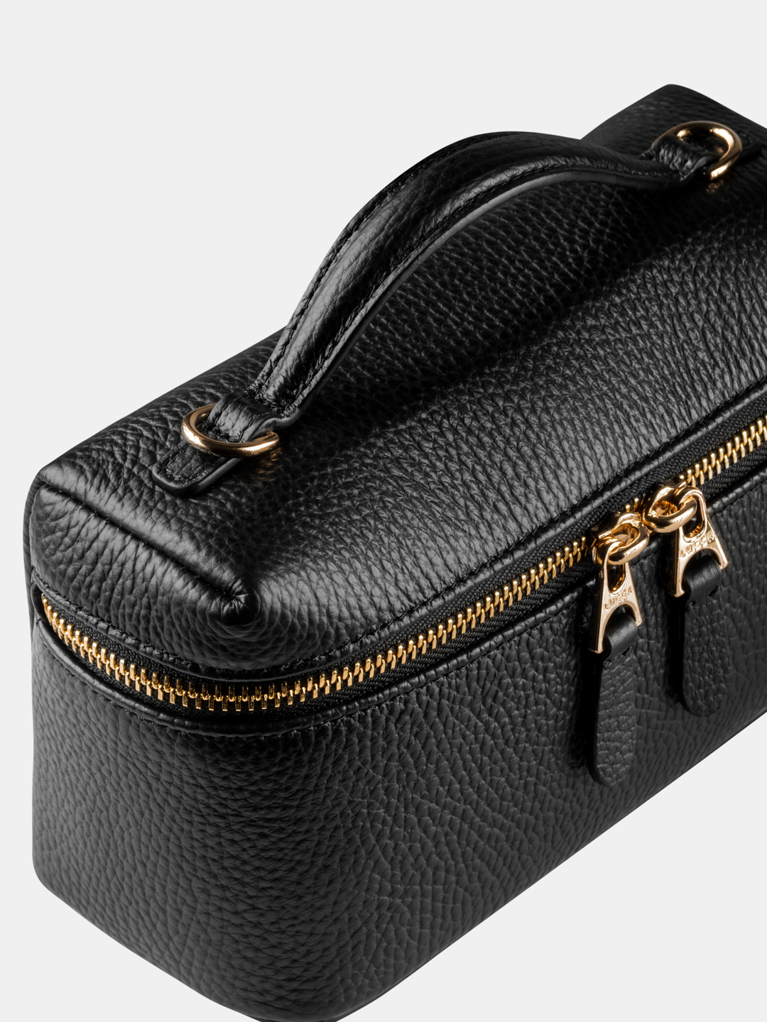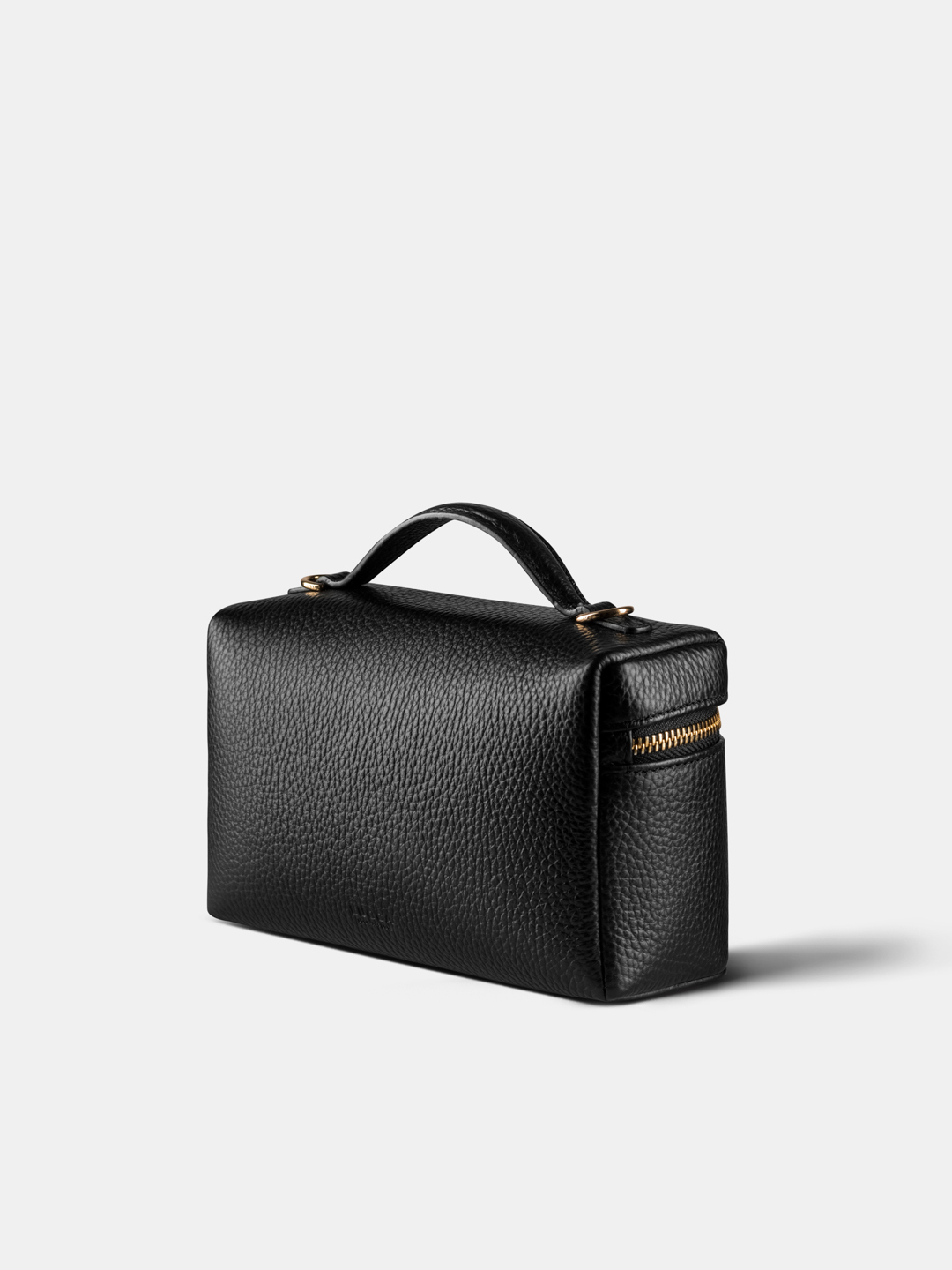 Выполнена из натуральной кожи, что придаёт изделию долговечность и элегантный вид. Прямоугольная форма с двумя молниями, которые обеспечивают удобный доступ к содержимому. Компактные размеры делают её идеальной для путешествий или повседневного использования.