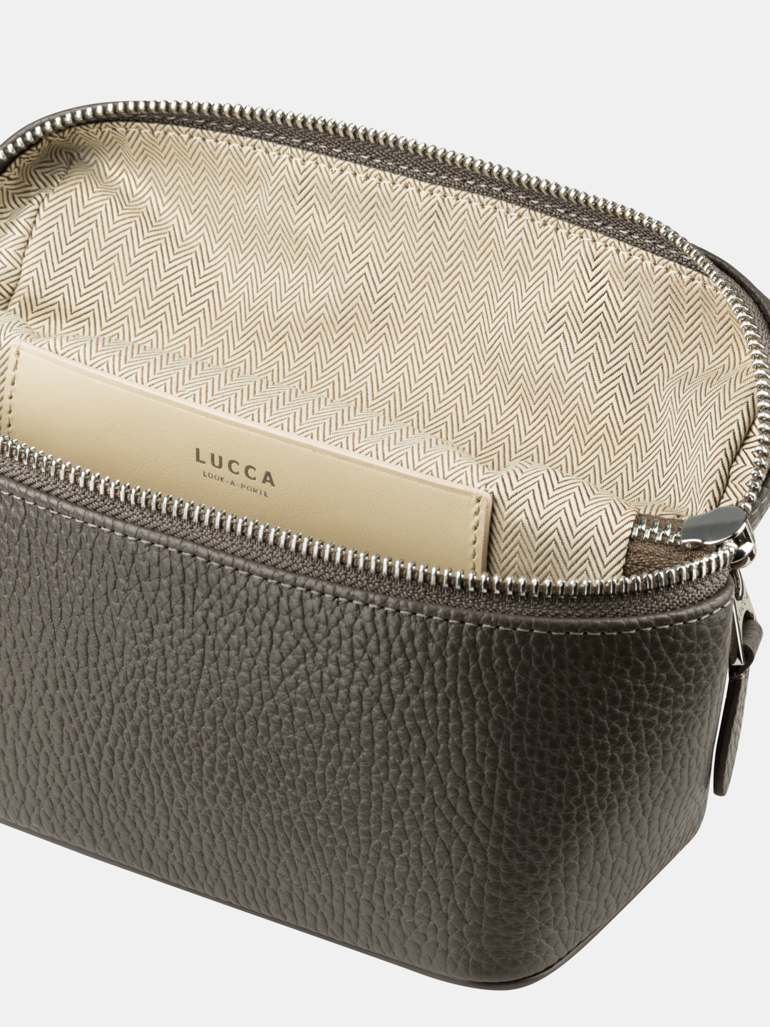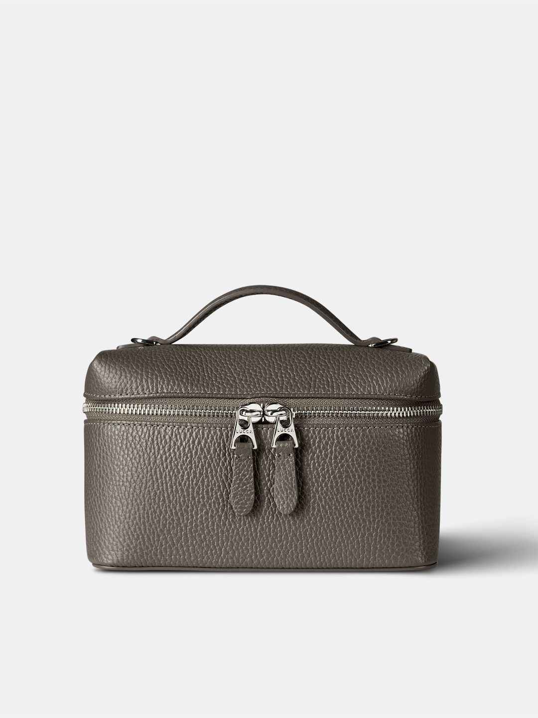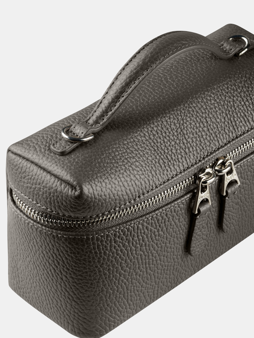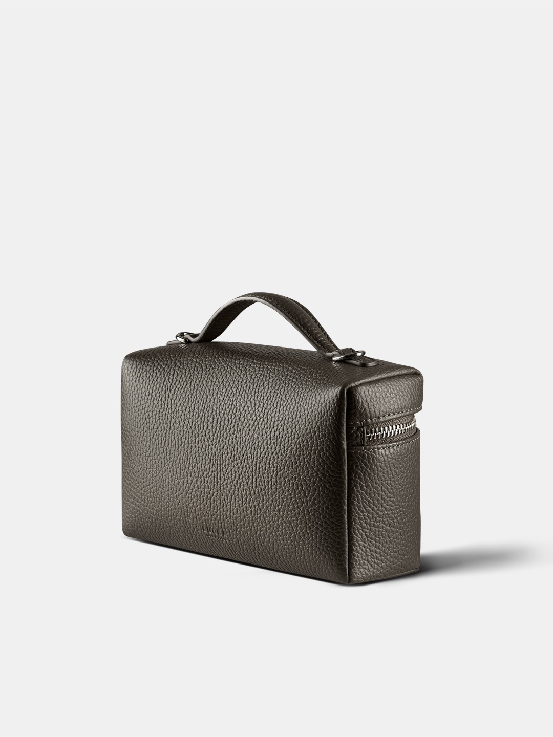 Выполнена из натуральной кожи, что придаёт изделию долговечность и элегантный вид. Прямоугольная форма с двумя молниями, которые обеспечивают удобный доступ к содержимому. Компактные размеры делают её идеальной для путешествий или повседневного использования.